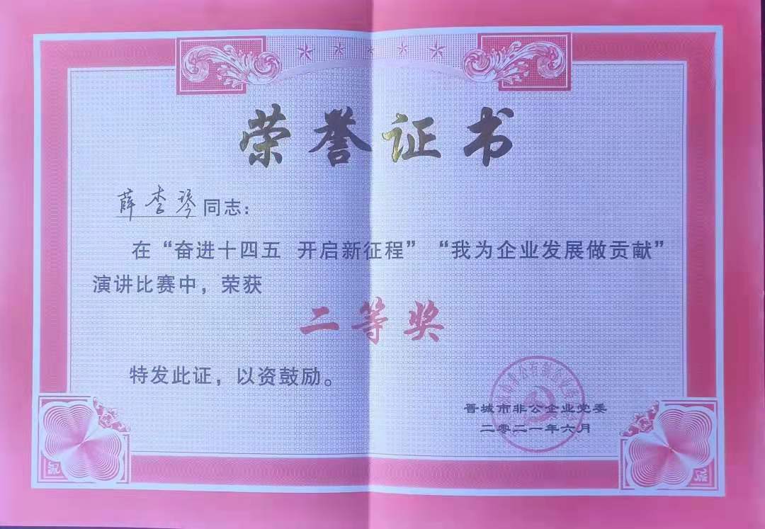 6月2日下午,晉城市非公企業(yè)黨委“奮進十四五·開啟新征程 我為企業(yè)發(fā)展做貢獻”主題演講比賽決賽在市市場監(jiān)督管理局6樓視頻會議室成功舉行。我公司選手薛李琴在決賽中榮獲二等獎。