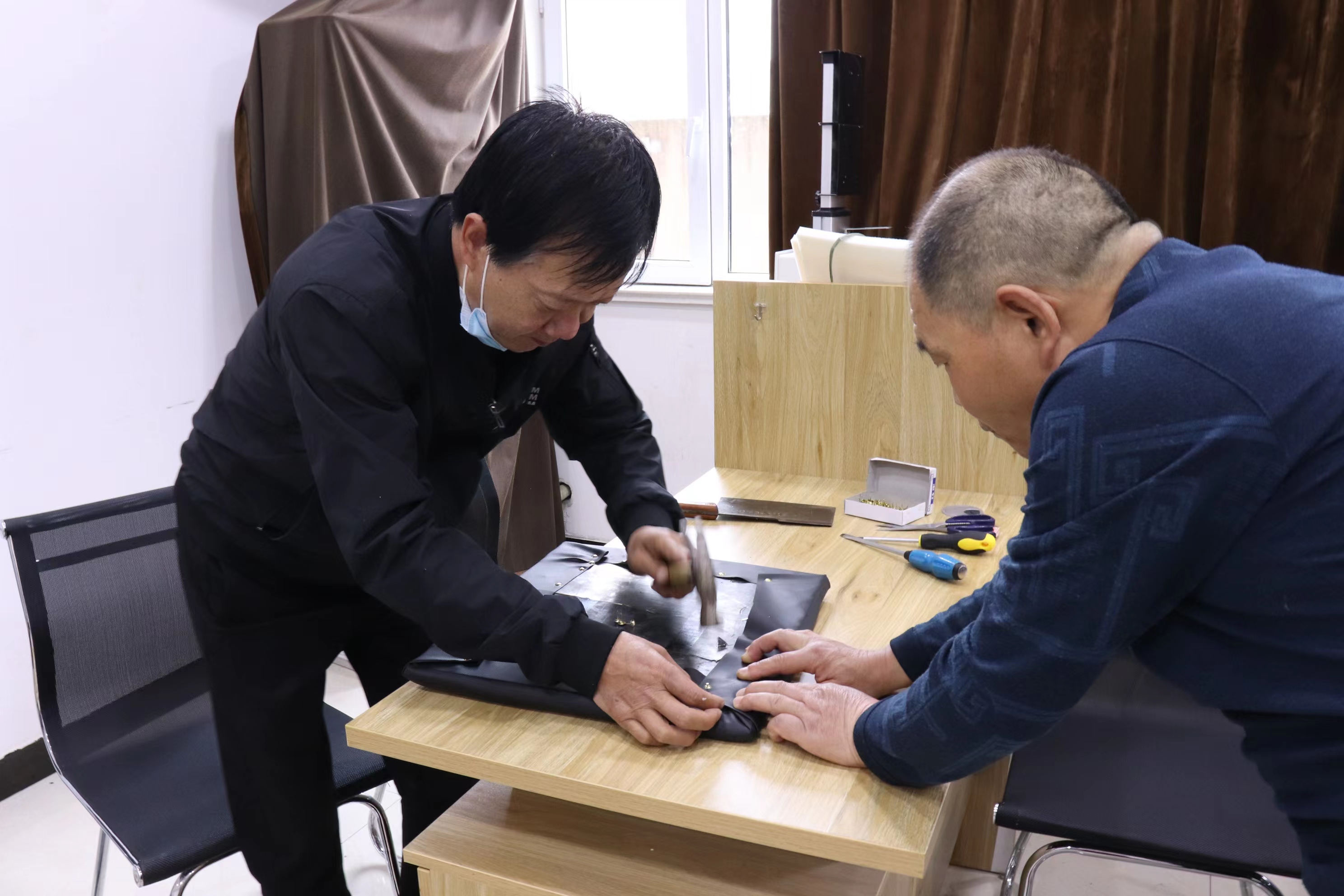 說(shuō)干就干。他們買(mǎi)來(lái)了海綿 、面料 、釘子,憑借衛(wèi)師傅以前的木工技術(shù)和田師傅現(xiàn)有的維修技能,對(duì)破損的椅子進(jìn)行了集中維修。叮叮當(dāng)當(dāng)……敲敲打打,手腳并用,不亦樂(lè)乎……