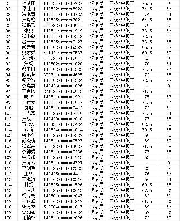 晉城市潔霸清潔服務(wù)股份有限公司職業(yè)技能等級認(rèn)定中心現(xiàn)將2024年2月25日認(rèn)定人員成績公示如下: