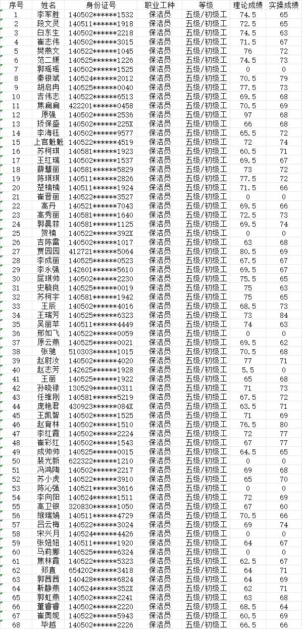 晉城市潔霸清潔服務股份有限公司職業(yè)技能等級認定中心2024年7月7日第20批保潔員初級認定人員成績公示