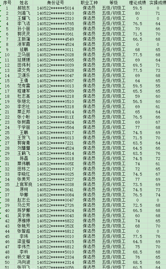 晉城市潔霸清潔服務(wù)股份有限公司職業(yè)技能等級認(rèn)定中心現(xiàn)將2024年8月17日認(rèn)定人員成績公示如下:
