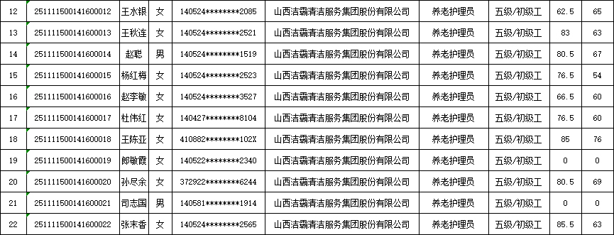 山西潔霸清潔服務集團股份有限公司職業(yè)技能等級認定中心現將2025年11月15日認定人員成績公示如下: